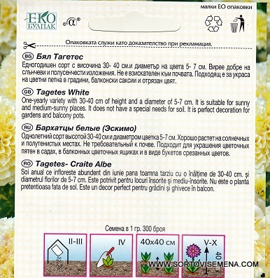 Място и почва: Предпочита слънчеви локации, но за разлика от други сортове, белият тагетес запазва по-добре цвета си при лека, шарена сянка в най-горещите часове.