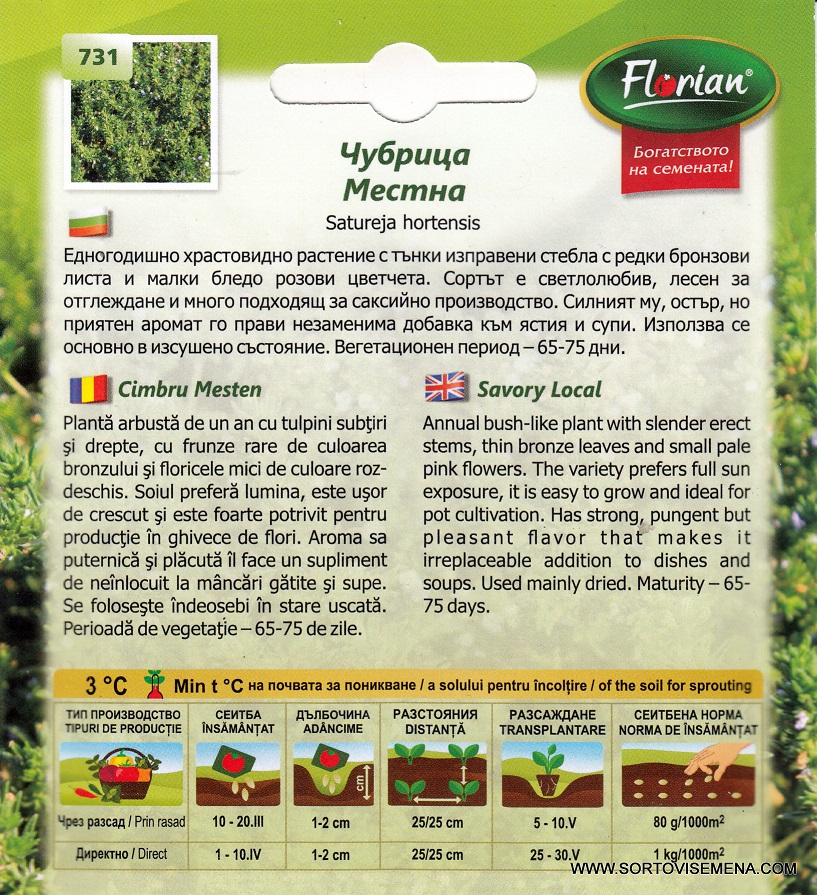 Представяме ви сортови семена за Чубрица Местна (Satureja hortensis) – класически български сорт, който е задължителен за всяка кулинарна градина. Това е едногодишно храстовидно растение, което се отличава със своя силен, остър и изключително приятен аромат. Благодарение на своята непретенциозност и компактен растеж, тя е перфектният избор както за големи градински лехи, така и за отглеждане в саксии на прозореца или балкона.