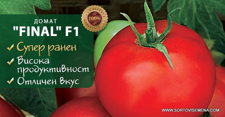 Представяме ви семена за Домати Финал F1 (Final F1) от селекцията на Флориян – нов български, супер ранен, полудетерминантен хибриден сорт домати. Този сорт съчетава супер ранозрялост с висока продуктивност и отлична транспортабилност.