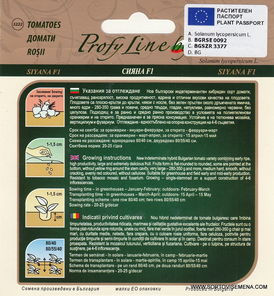 Представяме ви семена да Домати Сияна F1 (Siyana F1)нов български индетерминантен хибриден сорт домати, който се отличава с висока продуктивност, добра връзка, отличен вкус и устойчивост. Този сорт е идеален за любители и професионалисти, които търсят класически домати със сигурен добив.