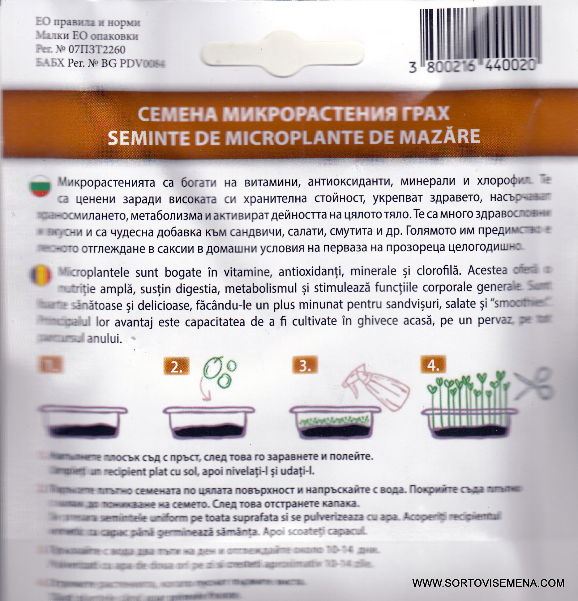 | 🛠️ Вид продукт | Семена за микрорастения (Грах) |