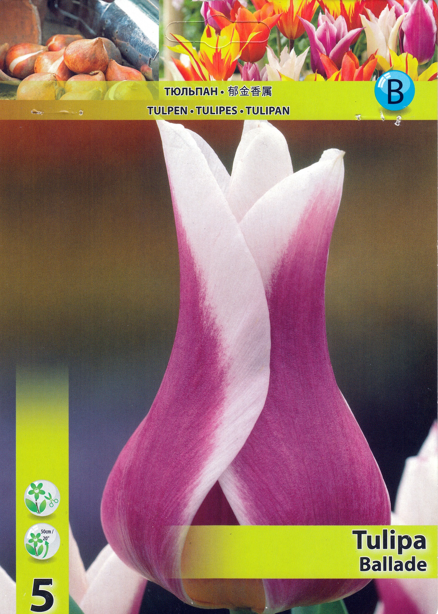 Представяме ви луковици на лале „Балада“, изящен сорт от групата на на Лилиецветните лалета. Тези лалета са известни със своята уникална, елегантна форма, която наподобява лилия. Венчелистчетата на Ballade се извиват навън в краищата, придавайки на цветето грациозен и изтънчен вид. Сортът се отличава с нежни розово-лилави цветове с бял кант.