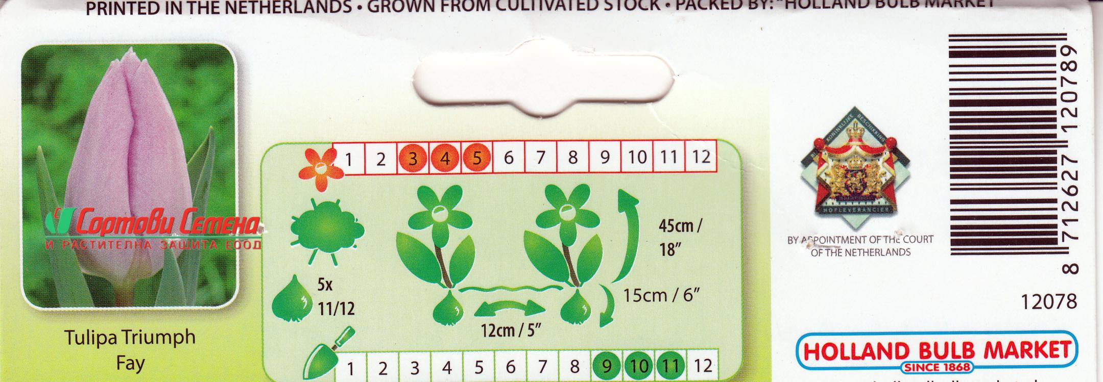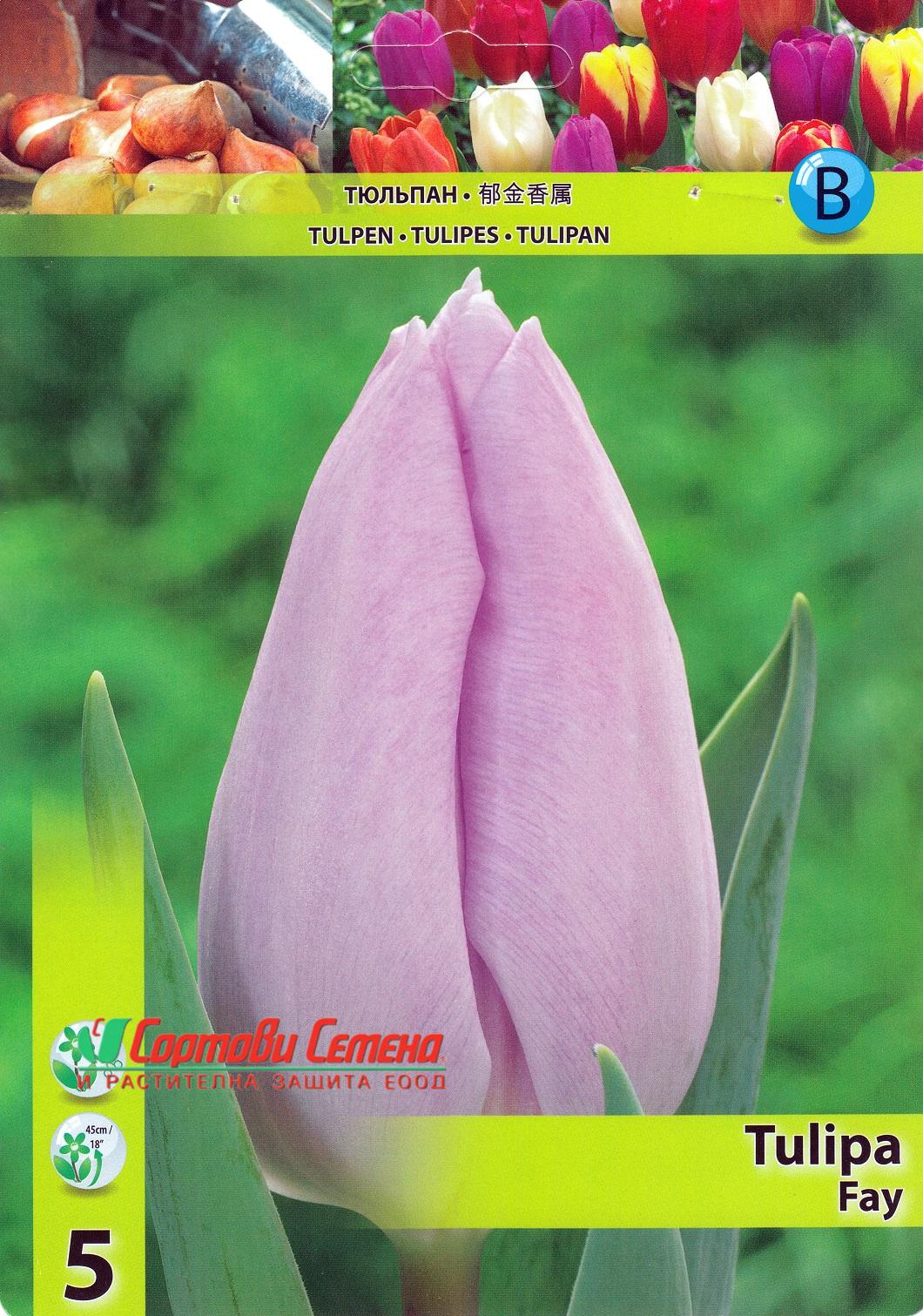 Представяме ви луковици на Лале Fay (Фей) , един изключителен сорт, който ще озари вашата градина с деликатните си лилави цветове и тъмно стъбло. Принадлежащо към групата „Триумф“, това лале е известно със своята класическа, единична форма на цвета и силно присъствие. Лале Fay е чудесен избор за създаване на нежни и романтични цветни лехи, бордюри или като рязан цвят в елегантни пролетни букети. Този сорт е сравнително нов и е много ценен заради уникалния си цвят и дълготрайния си цъфтеж.