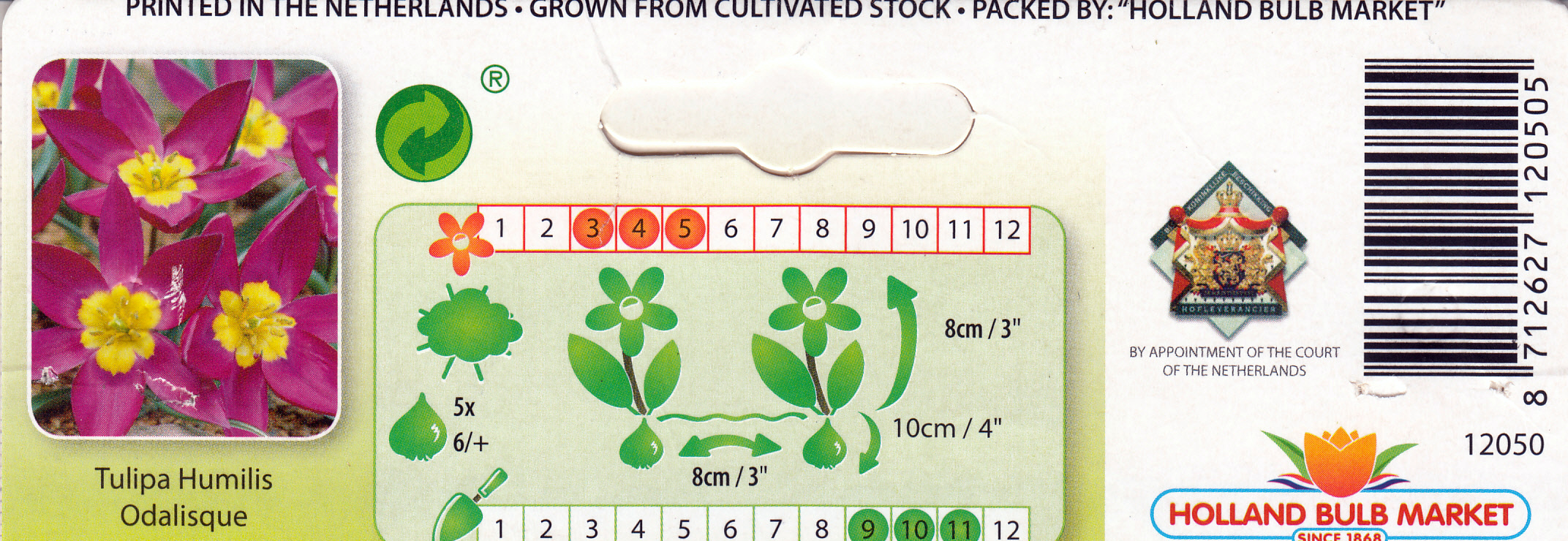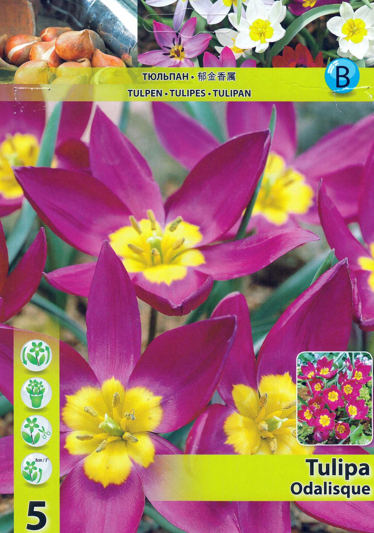 Лалето Odalisque е очарователен представител на групата на Ботаническите (видови) лалета, известни със своята дива, естествена красота и издръжливост. Odalisque (превод на името: „Одалиска“) се отличава с елегантни, звездовидни цветове в наситен лилав до виолетов цвят, които се разтварят широко, за да разкрият ярко жълт център. Тази забележителна комбинация от цветове създава екзотичен и изтънчен вид.