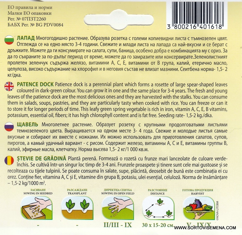 Представяме ви сортови семена за Лапад (Rumex patientia), познат още като „лопуш“ или „спанаков лапад“. Това е едно от най-ценните многогодишни растения в българската градина, което се появява сред първите веднага след стопяването на снеговете. За разлика от спанака, лападът има по-неутрален вкус и запазва своята плътност при готвене. Веднъж засят, той може да ви радва с обилна реколта от крехки листа в продължение на 3 до 5 години.