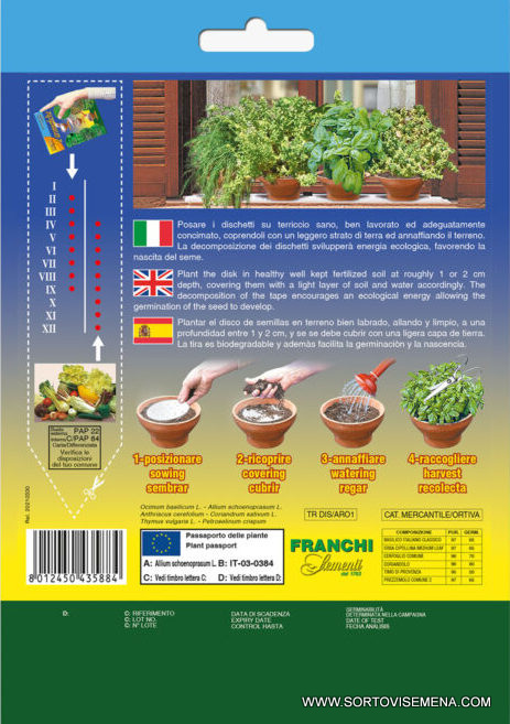 Всеки пакет съдържа по един диск със семена за следните популярни подправки: