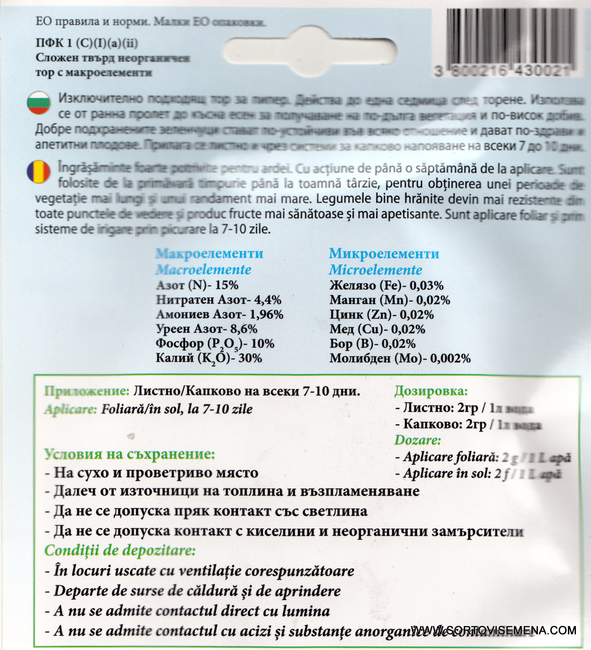 | 🧪 | Състав (NPK) | 15% Азот (N) – 10% Фосфор (P₂O₅) – 30% Калий (K₂O) |